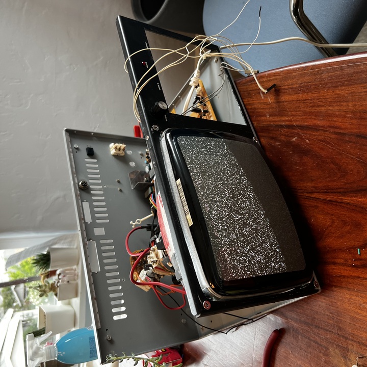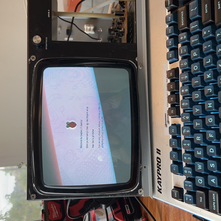 I wanted a functional personal computer that retained the CRT screen and basic form factor of the Kaypro, thus I had to devise a way of putting a color CRT with video-in where the green monochrome display once was. The Pi would sit above a metal plate for some shielding from the CRT. I ordered a small color TV, harvesting its tube and input board and putting them in the lower left of the case. An HDMI to composite converter takes the signal from the Pi and routes it to the TV screen. In the back of the case I put signal inputs that I used to attach USB peripherals. The floppy drive faceplates were detached from the drives themselves and glued together to retain the look of the drivebay without having to give so much of the internal space to the drive mechanisms.