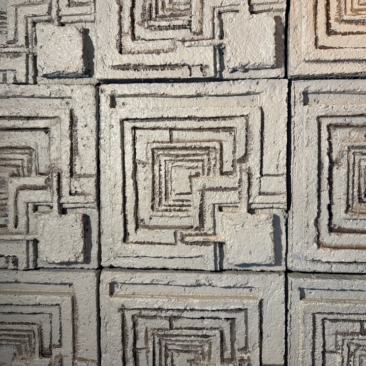 This is the point where I started to discern between concrete and cement, and cement with or without mix ins. My eventual solution was to add cellulose house insulation to plastic cement to create a faux concrete texture while adding limited weight to the overall mix. These also had more structure and I could produce an extra block for each bag of cement with this procedure. My goal was to create 9 blocks, enough to tile the width of one wall of my room while leaving a row of blank blocks to better represent the way the textile blocks were used in the real houses, I repeated the process until I had 9 good ones, then weathering the blocks with dark paint in the corners for better contrast.